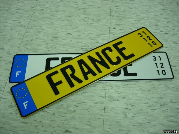 同場加映"原裝空運進口純正法國車牌組"520x110mm 表面反光鋁板材質很不賴的質感表面還有數個法國車牌專屬防偽暗記喔看圖先一白一黃(白色為前車牌,黃色為後車牌)車牌排排站,為3M高科技熱縮模反光材質歐盟環狀星圖案+法國F代號歐盟環狀星圖案DIN鋼印字樣DIN鋼印字樣(拍的不好請見諒)模版打出的立體樣式,真是有質感呀照不出DIN防偽標誌的樣子借張真實的圖案來秀一下前牌正面加上後牌背面來張疊疊樂囉歐盟VDAT認證標籤剩下就等裝上車囉