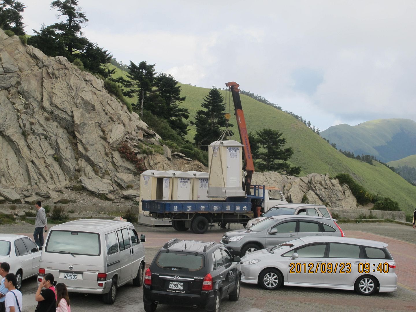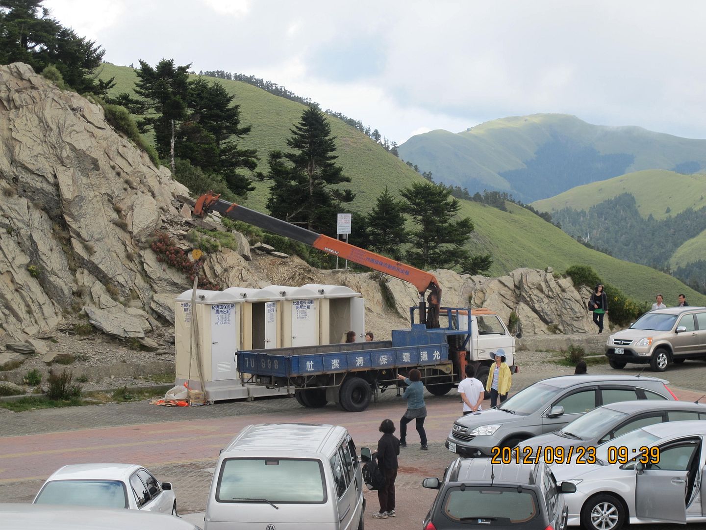 工程車把為前一天自行車活動準備的流動廁所吊走。