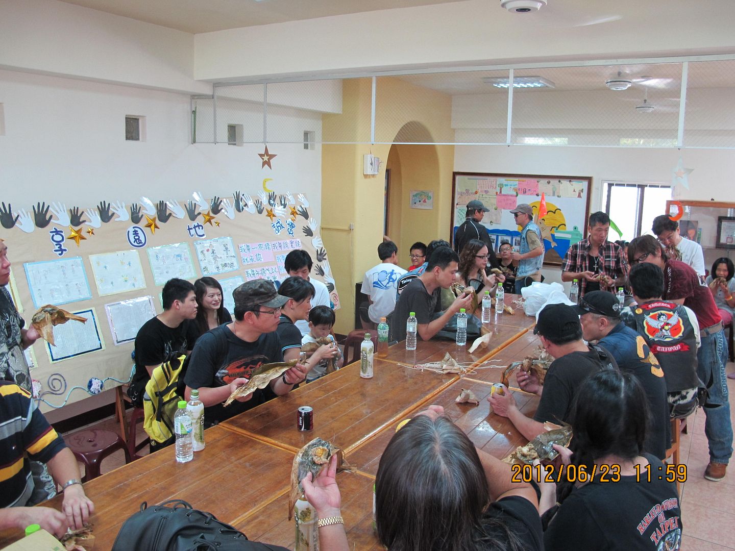 一桌兩位義工車友 ~ 服侍伯大尼憨兒們吃粽子。