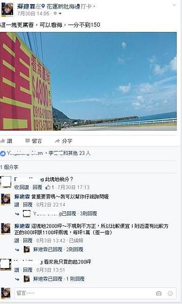 14:05:臉書打卡記錄。這一塊更厲害,可以看海,一分不到150萬@花蓮新社海邊