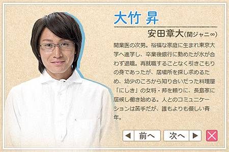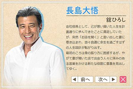 臨近退休的商社常務,原本想跟妻子綾環遊世界,沒想到綾卻對他說出了自己長久以來的夢想,要在自己家裡開餐廳,這突如其來的決定打亂了大悟的計畫,讓他頗為苦惱。館廣在戲裡飾演一個溫柔的好男人,處事老成,但有時又有著童稚般的心,像是個老頑童,讓人非常喜歡。