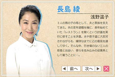 幾個兒子結婚獨立以後,放下了母親的重擔,於是想要完成心中長久的夢想,在自己家裡開餐廳,即使家人大力反對,她還是鐵了心要做。淺野溫子飾演一個強勢的太太,在戲裡面的表現雖然有些誇張和聒噪,但她發嗲的模樣其實我還挺喜歡的,而且睡前跟館廣在臥室裡,常會做出一些大媽的舉動,讓人覺得十分的莞爾。