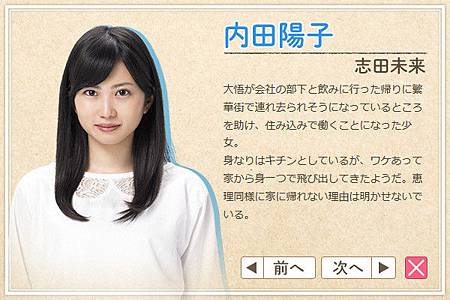 從少年懲教所出來的不良少女。大悟與下屬交際應酬時,見義勇為,把她從流氓手中救出,並帶回家中讓她在此打工。隱藏過去,自稱沒有家人,高中也還沒畢業。跟志田未來近期的幾個角色比較起來,突破並不大,看來陷入童星轉型的尷尬,希望能找到戲劇圈的新定位。