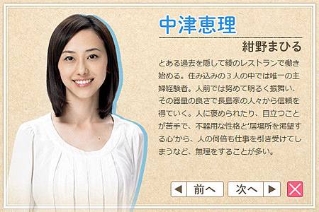 大悟和綾在網路上刊登應徵廣告後前來面試,因為丈夫家暴而逃家,走投無路下甚至下跪請求綾雇用她,最後綾點頭讓她在餐廳工作,而為了報恩,她也比其他人加倍努力工作。印象中紺野真晝似乎也有演過同樣類型的角色,可能跟她眼神總是帶點憂鬱有關吧!