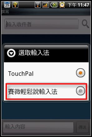一切設定完畢後就可以準備開始使用賽微輕鬆說輸入法了,首先找一個需要輸入文字的功能(如:簡訊),點住文字輸入框不放就可以切換輸入法: