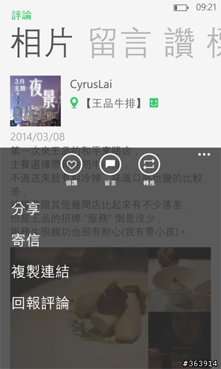 在這裡,點一下右上角的點點點,這裡就可以分享到你有安裝的SNS上了,嗯...所以想跟朋友分享好吃店家,要多點一層到留言頁來...