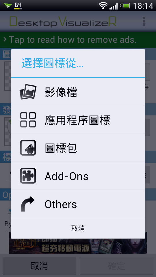 Rickyou wrote:大大的桌面太強了,可否分享如何改成這樣?應該很複雜吧? 不會很複雜,懂了就很簡單呢 --------------------------打字很辛苦,若要分享請引用整篇文章,感謝----------------------------這是首頁這裡使用到的有 Desktop VisualizeR,Simple Text-Text Icon Creator首先到程式選擇裡,像要在桌面建立個捷徑似的長按Desktop VisualizeR將它放置在下方4個位置其中一個接著點入擺放好的Desktop VisualizeR,先點下中間的"選擇操作"啟動應用程序。這裡以電話為例,選擇"電話"再來點上面的"選擇圖標",從"影像檔"去選個喜歡的圖案就會像這樣。點下"確定"就會在桌面上出現一個自訂的"電話"圖示了。跟待會要教的不同的是,這個圖示是可以放在下方當作快捷的,因此圖案會比較小些而這個文字型的圖示是由Simple Text-Text Icon Creator來建立的,可以創造簡單的自我風格喔繼續往下走~這是左邊第一頁,中間那8個Icon是各常用app的分類資料夾這裡用到的除了有前面的Desktop VisualizeR之外,還有Folder Organizer lite,Elixir 2,Elixir 2 - Widgets首先在Folder Organizer lite裡設定我們需要的"標籤"像我是設定這樣然後在桌面長按建立一個1X1大小的Desktop VisualizeR捷徑 (選左上角有紅點的)點下那個捷徑一樣先選"選擇操作"。不同的是這次要選"其他->FO Folder link-FolderOrganizer選擇要創建的資料夾,之後就跟上面是一樣的了在Folder Organizer lite裡的"偏好設定"可以這樣選以後有安裝新的應用程式的時候就會跳出一個選項,問你要把這個新的應用程式分類到哪個資料夾中對了,圖示我都是上XDA去找的,有很多人樂於分享他們的創作呢XDA搜尋連結Elixir 2則是完全可以自訂的東西了,現在也有全繁體中文的介面,可以自己玩玩看若不懂再問吧