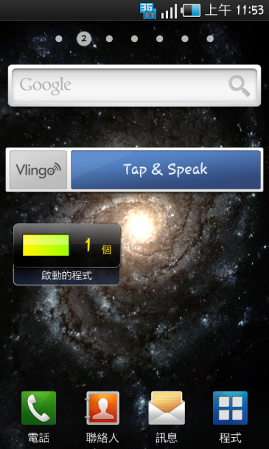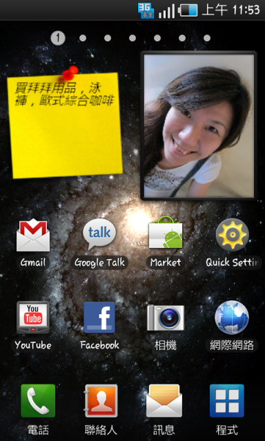 我的i9000 16G螢幕保護,galactic core wallpaper動態桌布post it & 內建相框Google搜尋bar , Vlingo語音bar , 程式管理工具FB & 內建相框內建日誌功能weather clockYoutube bar & google定位今日動態