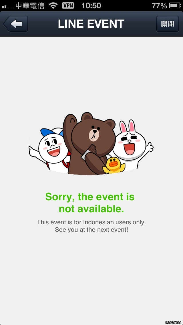 剛剛測試了一下小弟手邊的唉鳳,在台灣直接點活動會向下圖從印尼開會顯示如下看起來好像不是看登入IP來認國家的樣子....不知道它用什麼來判斷非印尼...就等待是否有神人能解決了@@測試在印尼點854也會跳出程式,但就是不給載@@