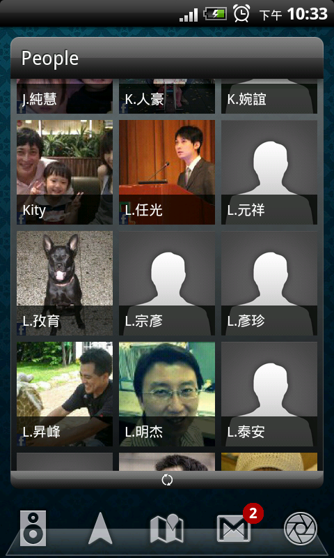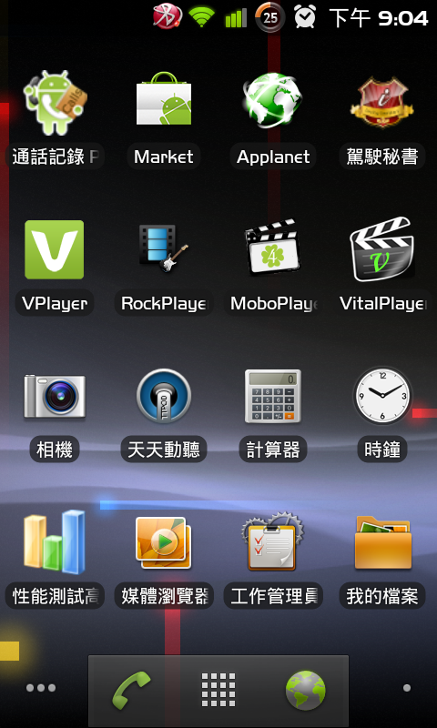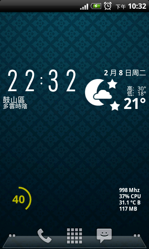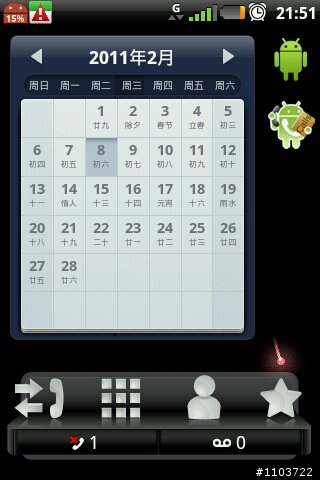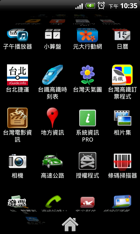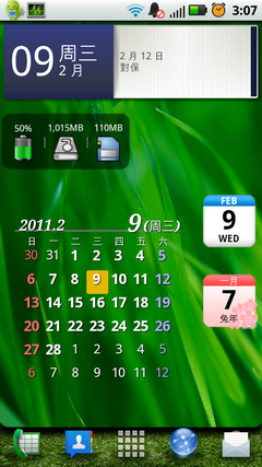我的 garmin asus a10,adw pro,6x7格,6x7下大部分widget看起來不錯,少部份就有點缺憾。主頁,大部分慣用跟自己需要看的東西,展示用的就免了,左上日期試用到期了,尚未買正式板 XD。左一,用desktop visualizer跟slicer做的聯絡人,把main dock隱藏了,不然不能顯示成全畫面。右一,月曆有農曆,過年前後還蠻好用的,不用多開農曆工具,下方保留a10原來的電話widget,因為找不到有同樣功能的,有人能推薦嗎?右二,偶爾才會用到的,剛好也都是widget尺寸顯示比較不漂亮的,另外icon都是folder organizer。