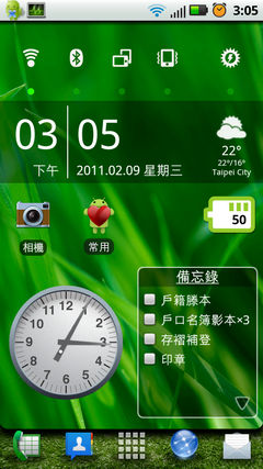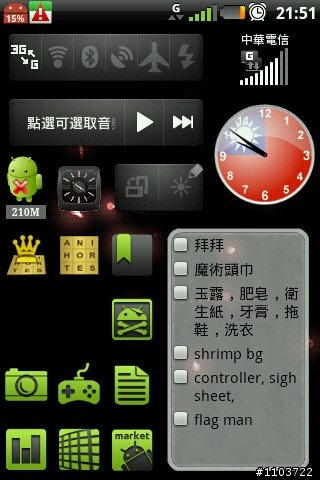 大家好, 我的手機是MOTO MB525, 也來分享一下綠色系列的桌面擺設很不規則的主頁... , 不過放的都是蠻實用的東西..MOTO內建的日曆小工具(頂端).. 縮放成橫幅,個人覺得蠻好看的..那個機器人提示小工具, 其實總共只有六個提示, 純粹裝飾用