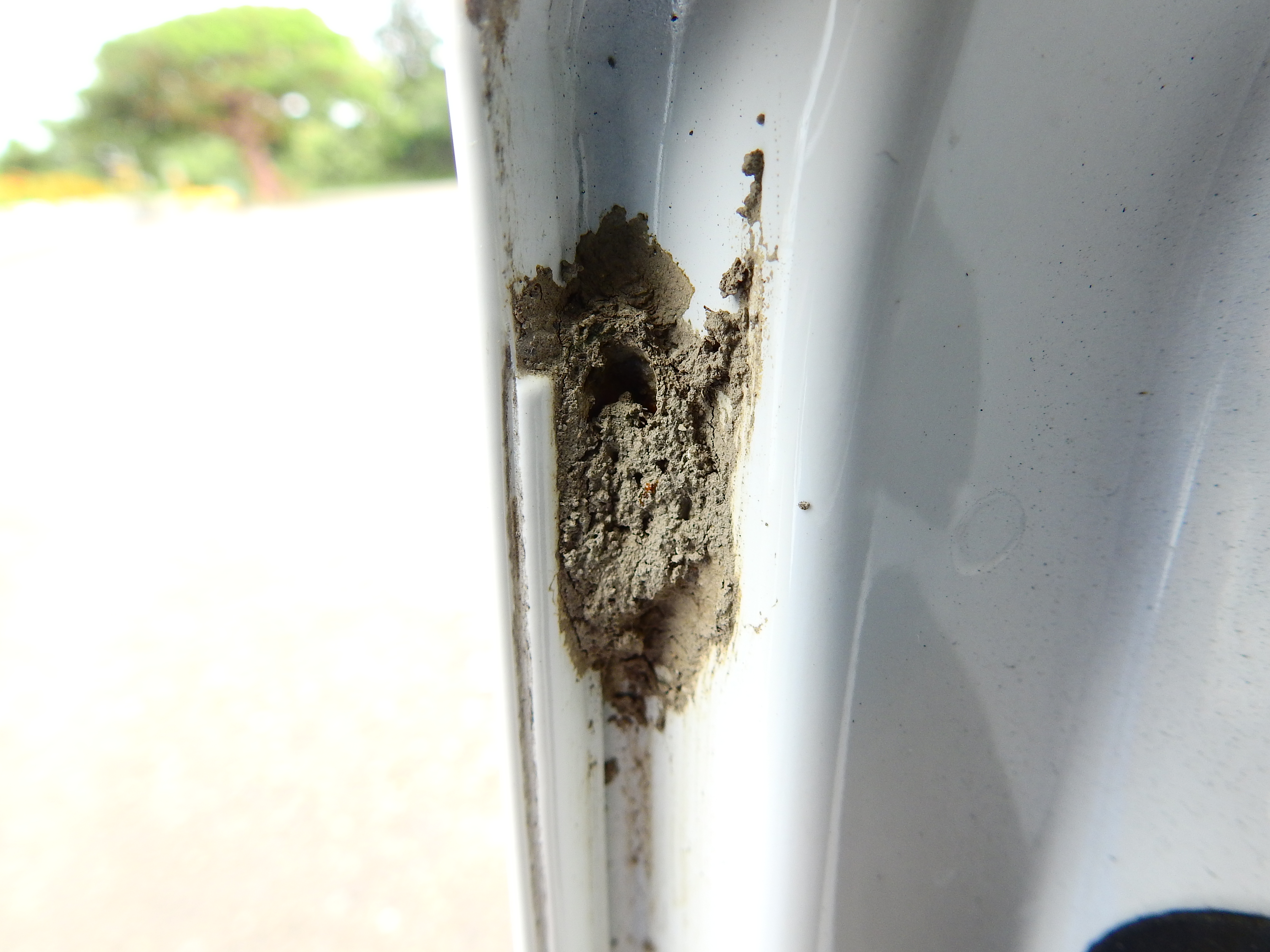 這真是奇怪的狀況昆蟲飛進車上是常見的但要能飛到車上築巢到是蠻怪的M7T(MPV)滑門下半緣沒有膠條可能較小型的昆蟲由小縫飛入給自己蓋房子(車身上有膠條,所以小蟲在關門時是飛不進車內)最近我的M7T常飛入蚊子身在一級戰區的台南這種狀況讓我們全家都很緊張尤其去年雙十節老婆、小孩回高雄時被叮而得到登革熱沒想到今年台南又大流行真是傷腦筋
