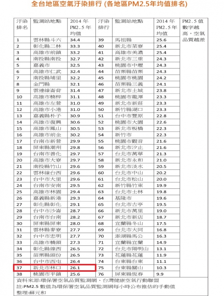 engcalvin wrote:不過還是搞不懂,林口哪裡空氣不好? 已經說過了!空污好不好要看長期的數據,你只是一直貼幾天的數據沒有用!↓ 這是幾年前的資料,我手上沒有新的統計,你如果有就貼來看,林口的確是新北的空污一哥!