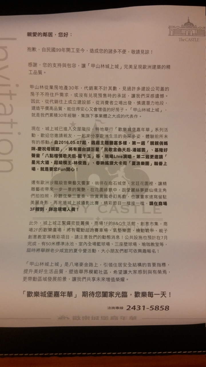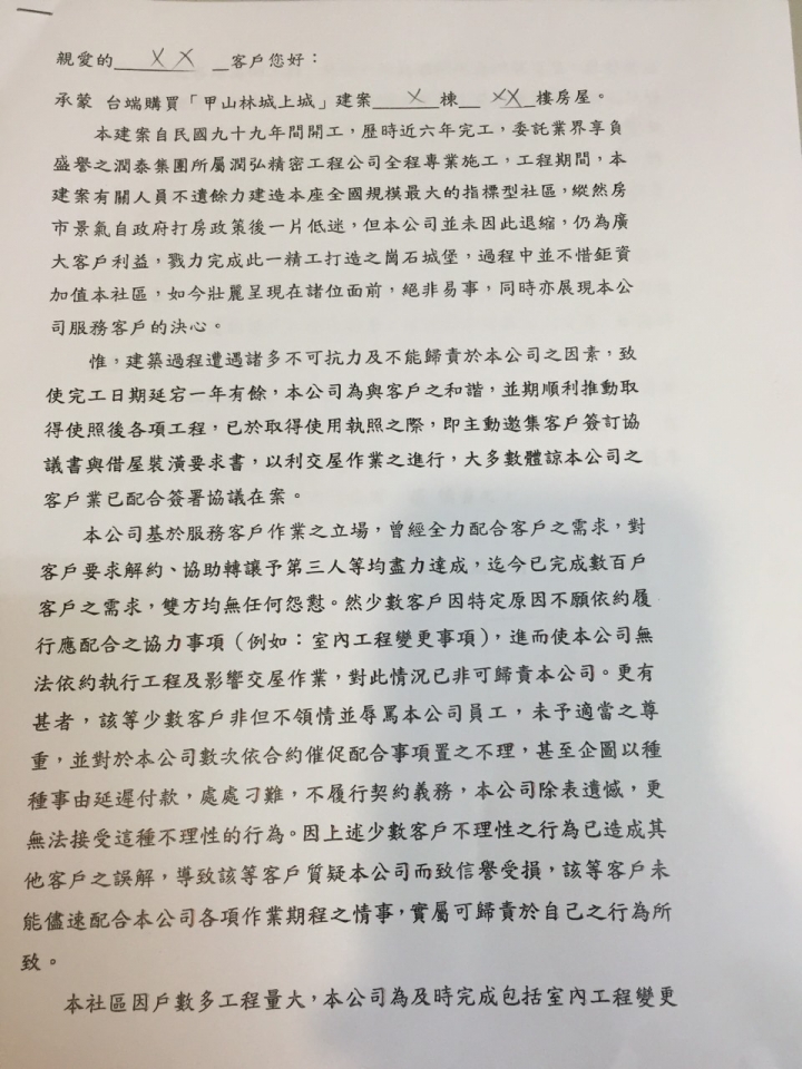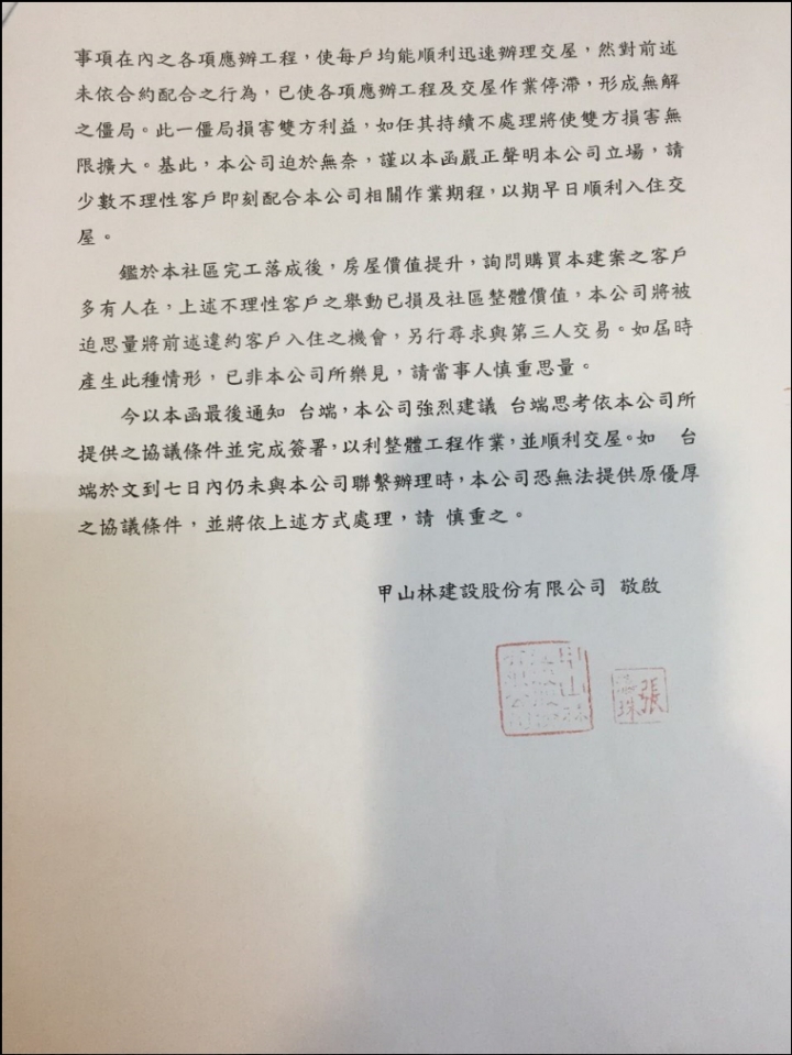 不肖甲山林建商因私人因素延遲交屋一年多,還不履行合約內容。合約內容提到若沒有如期交屋將罰款違約金房價的萬分之二賠償給屋主,而甲山林與城上城屋主開會,卻逼屋主們簽署同意願意只收一半(即房價的萬分之一)的賠償金,不同意的屋主甚至還收到甲山林的恐嚇來函,內文表示若於七天內沒主動收到屋主的同意簽署,就無法按原合約條件成交,更威脅說要把房子轉賣其他人,威迫屋主同意這不平等條約。建商卷入貪污弊案造成延遲交屋卻又威脅要屋主來承擔,實在是太離譜了。