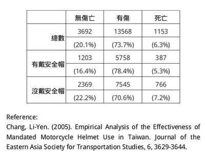 "這邊的公共利益是需要討論的地方。首先以最直覺的聯想,是不是沒戴安全帽就會造成機車騎士的傷亡?我在交通部的統計資料找了好久就是沒有原始數據,後來找到一份由台灣學者做的研究報告,裡面引用的資料是直接跟交通部要原始數據整理而來 (等於是交通部沒有把這統計資料公布給大眾就是)。參考的研究報告為Chang, Li-Yen. (2005). Empirical Analysis of the Effectiveness of Mandated Motorcycle Helmet Use in Taiwan. Journal of the Eastern Asia Society for Transportation Studies, 6, 3629-3644。根據這份研究報告,裡面可以清楚看到以機車為主的交通事故分為 1.無傷亡 2. 有傷 3. 死亡。取得的原始資料總數為18413, 扣除無法辨認的檔案,可讀的資料為18028,因此代表最後的統計結果最高有正負2%的誤差。統計資料的期間為1996年十二月到1997年十二月,也就是強制執行戴安全帽的前半年到實施後半年,統計的大綱如下: