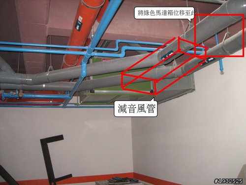 下午PM14:00工務所會同排風機廠商現勘要將B1排風馬達(圖一綠色箱體)位移至(圖二)右上角紅色框框位置.並施作箱體的隔音包覆並增加一段減音風箱(圖二)藉由排風馬達與出風口的距離增加來減低噪音回風出口內壁(圖三)增加吸音棉以防止回風處聲音的回受大約需10天的工作天圖三內增加吸音棉的裝置就如同我們玩音響的人在視聽室內防止聲音產生二次的反射原理是一樣的唉!真的已經沒時間再去回應這些無助於工作推展不是問題的問題!(圖一)綠色箱體為排風馬達(圖二)預計位移後改善的位置(圖三)開放空間人行步道上方之排風口內回風處
