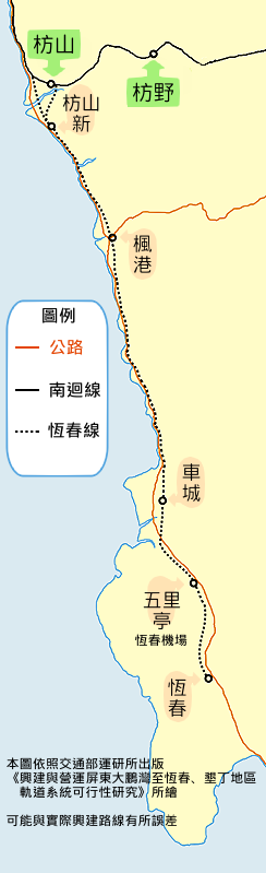 恆春觀光鐵路 預計民國115年6月通車國發會委員會2017-04-11通過恆春觀光鐵路為紓解墾丁國家公園每年800萬人次的觀光人潮,並發展恆春半島的觀光,國發會委員會議昨(11)日通過「恆春觀光鐵路可行性研究」,預計花199億興建37.7公里的鐵路,讓火車可從高雄直通恆春,估計民國115年6月完工通車。依據規劃,將從內獅站起沿線新設七站包括新枋山、楓港、竹坑、海口、車城、五里亭到終點恆春,全長37.7公里,總工程經費199億元。