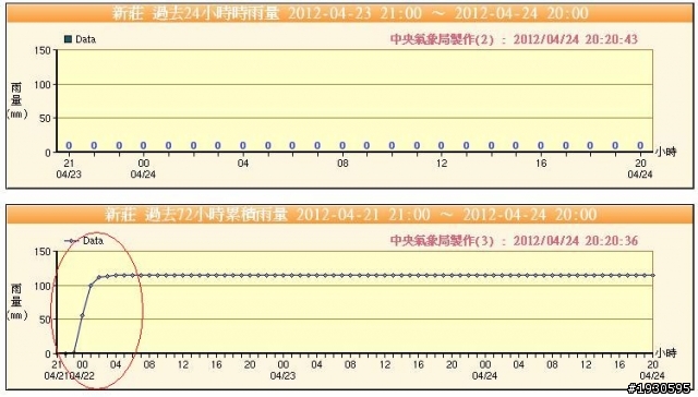 水利局副局長宋德仁說,根據中央氣象局統計資料,昨天凌晨零時左右,新北市間歇性降雨量一小時達四十到六十毫米,新莊和蘆洲累積降雨量更超過一百毫米,遠超出市區側溝與排水系統負荷量,各抽水站雖提前於前晚十一點半抽水,以降低大排水路水位,但因瞬間雨勢過大,雨水一時無法全數流入排水系統,路面才會出現積水、淹水。