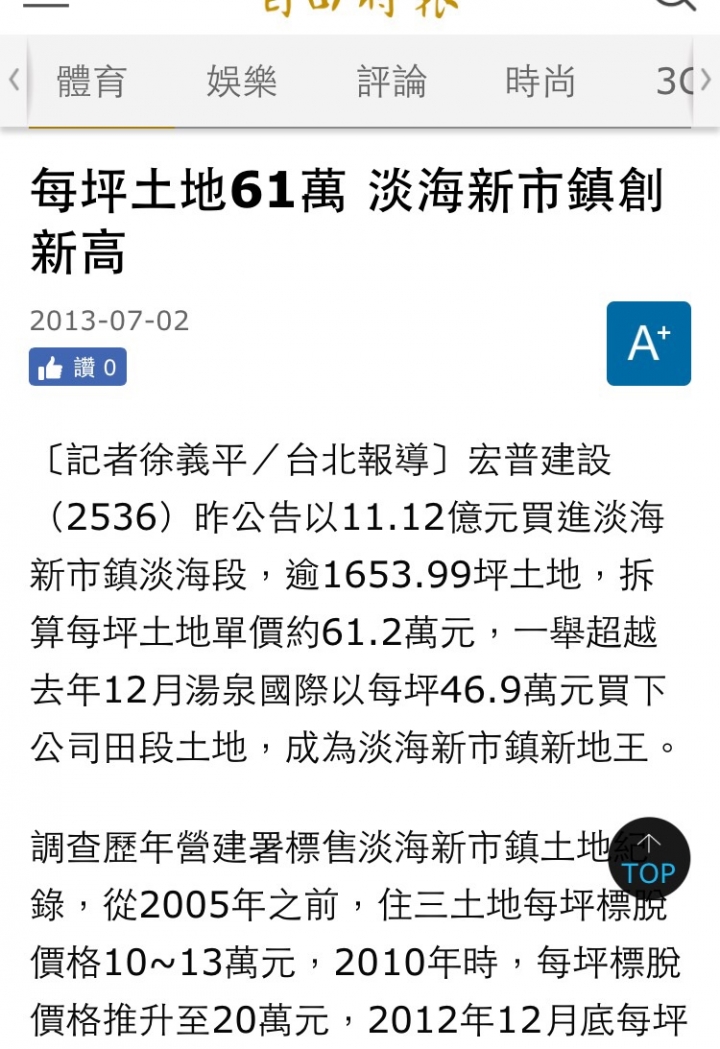 本來淡水新市鎮,政府規劃是一坪六萬,當初也蓋了一棟。由此可知,那里的地價徵收有多便宜,加上整地,房子一坪賣六萬還是有賺的,可見建商暴利有多少。新市鎮現在三分之一還没蓋完,呵呵,除非台北人全跑來淡水,未來淡水就可以期待,但是台北就變成鬼城,跟美國底特律一樣,從第一大城變成空城。大家都覺得淡水是退休的好地方,一個退休的地方房價還想怎麽樣,他的特色就是便宜低價。