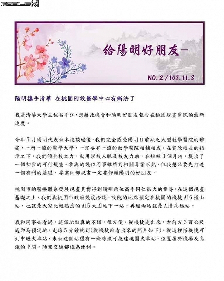 Rickie3938 wrote:樓上提的已經是過去...(恕刪) 是現在進行式吧!桃園市政府與國立清華大學今天上午在市府簽訂「醫療暨教育研發園區合作意向書 (MOU)」,由市長鄭文燦、清大校長賀陳弘共同簽署,雙方決定在桃園航空城園區興建一所國際級醫學中心等級醫院,賀陳弘形容這項合作是「強強合作」,鄭文燦表示,桃園醫療服務具國際優勢,與清大合作發展國際級醫療、教育及研發園區,希望把台灣醫學、電子、機械、化學各方面優勢跨領域整合,打造一所尖端醫院。鄭文燦與賀陳弘代表雙方簽署醫療暨教育研發園區合作意向書,也是清大第一次跨進醫學領域,該合作意向書為期3年,未來興建醫療教育園區經費由清大支應,桃園市府提供興建醫院及教育園區的必要協助。市府表示,發展重點在興建醫學中心等級醫院及專業人才養成教育,配合桃園市智慧城市亞洲矽谷計畫。今日新聞:桃市府清大要蓋國際級醫學中心 鄭文燦賀陳弘簽合作書https://udn.com/news/amp/story/7324/3756593