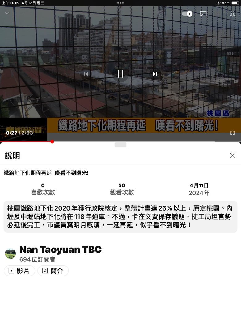 最近看了苗栗地方新聞時,TBC聯播新聞說桃園市縣政建設,有議員質疑桃園市台鐵地下化進度超慢。聽說還要10年在10年才能完成。那投資小檜溪的和台鐵中壢火車站桃園火車站,不就又要套20年了。連議員都炮轟市府團隊,說桃園舊城區又要倒一堆商家了。中壢區更不用說了沒救了。新聞後補上