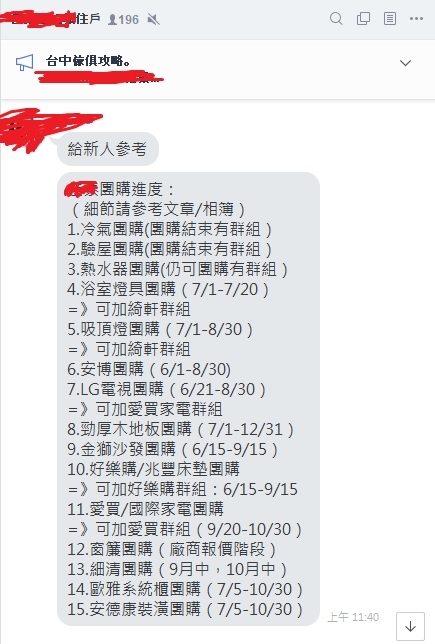 2. 不知道事不是我比較晚進群組,我並沒有看到您所述說的狀況,可否提供對話紀錄呢?我只看到住戶們彼此交流優惠的價格,也沒有特定哪位負責團購,而是個別有推薦的,開另一個群組,有興趣的人申請加入群組個別討論。