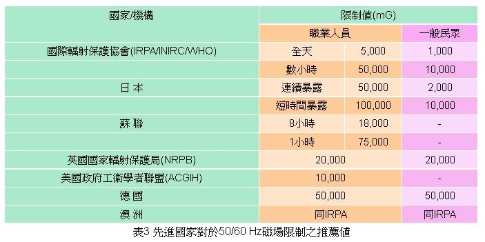 chin_eh wrote:提供一般家庭電器使...(恕刪) 下圖是一些機構的推荐限制值:家電低頻電磁波值在距離1公尺後的量測值都很小,所以保持幾公尺距離就低於1mG,至於變電所,透天社區旁變電箱,大部分在室內測都沒有了!剩下的是心理及觀感的嫌惡設施了,所以有些社區用南方松之類的把社區的變電箱包起來!低於1mG雖不影響健康!遠近多少會影響一點房價!擔心的人可以到pchome 買低頻電磁測量計(頻率50/60Hz or 俗稱高斯計),約1千上下而已,自己可以買一隻隨時量,要買屋看屋族最好自備一隻中古屋可以測!若要可以監測紀錄整天的儀器就貴很多,為何要記錄?尤其半夜睡覺時!舉個實例,幾年前有朋友在金山街大套房租屋,常半夜睡不好醒來好幾次,因金山街以前靠近陰間朋友~常懷疑是被靈界朋友干擾,但大家都是學理工做IC及半導體工程師,就算是靈界朋友應該也可以被監測到!但紅外線及溫度監測設備太大,所以先拿手持高頻電磁測量設備頻率50Hz~3GHz,放床頭櫃做游離輻射檢測~一開始白天都正常,隔幾天半夜又常醒來,打開Cornet測試器,發現LF & RF 的直上下跳動很大~以為靈界朋友出現,嚇的不敢睡到天亮,隔天跟公司借設備的RF FAE工程師講,就換一台更高檔設備接USB到筆電開整晚紀錄,發現LF值高達50~300mG,而RF頻譜2.4GHz左右高達100~500微瓦(μW)跳動...FAE工程師心中已經有答案了!原來朋友床頭後面牆壁是另一住戶的電視及電腦還有WiFi分享器,半夜電腦在打怪及WiFi設定另一電腦用驢子透過無線在下載A片,後來將床頭調另一邊,RF量測值只剩1/5以下,就比較不受影響~ LF能量低好像影響睡眠不大~高頻電磁測量設備 ~3GHz ,pchome也有賣 大約3千上下吧!最近好像很多有5GHz的WiFi,改天來借來8GHz的設備檢查一下住家四周~~