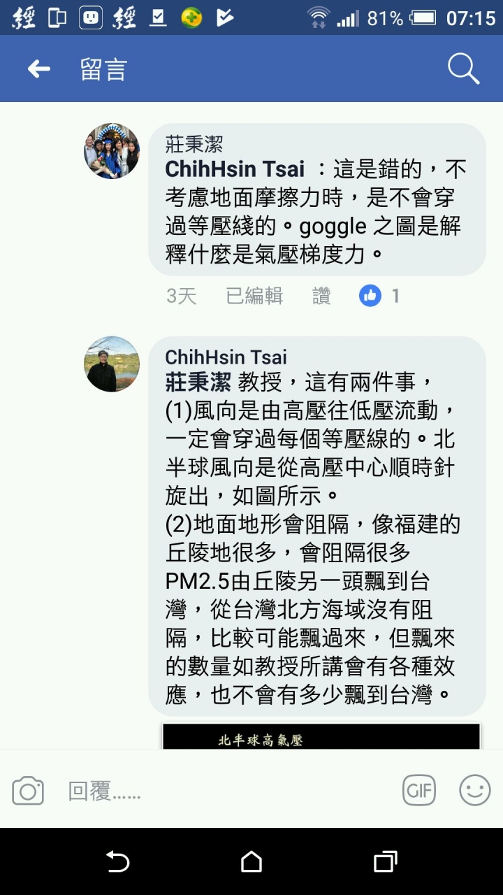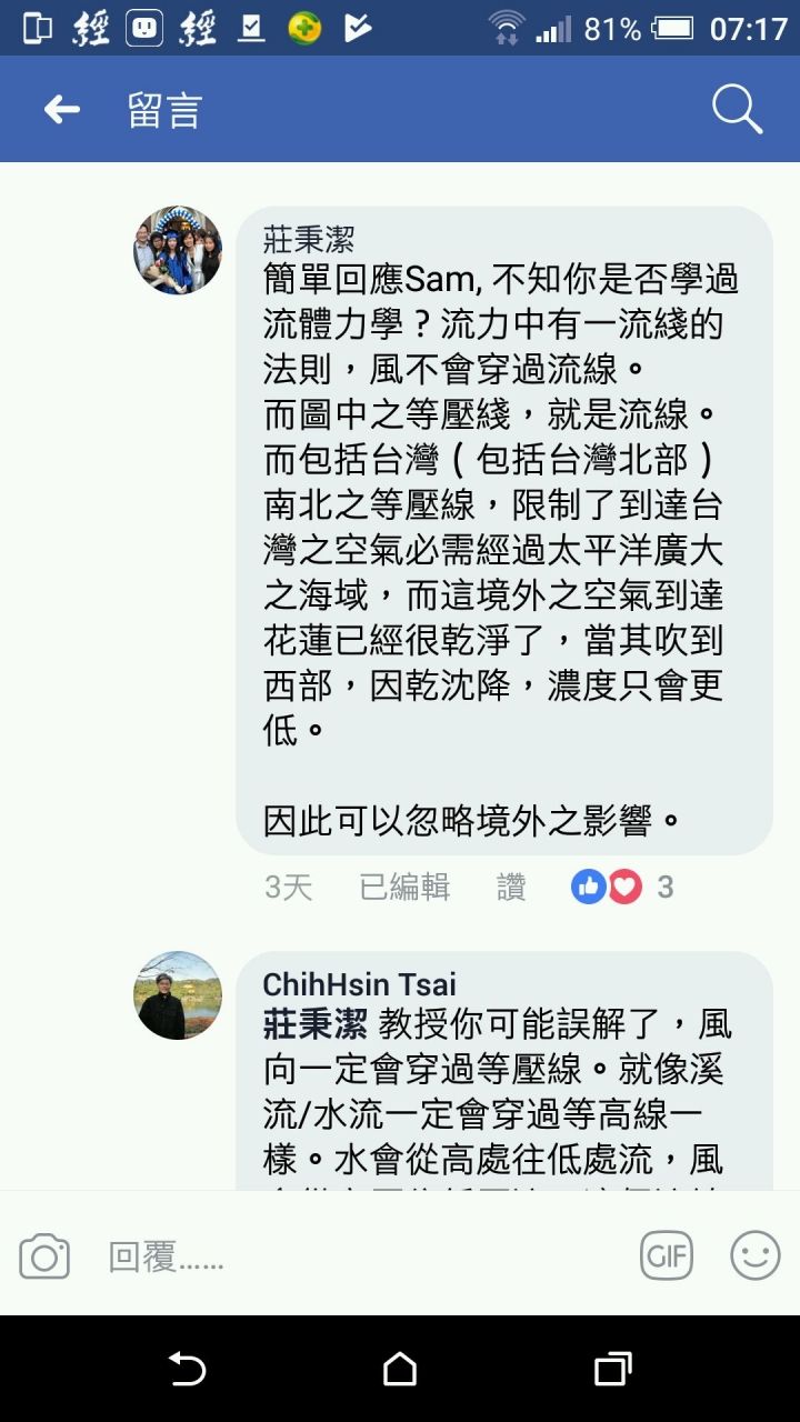 去玩一下 147 樓的網站點了一下 PM1.0 PM2.5 PM10的分類似乎沒什麼差異看了他是用衛星資料請問一下 PM2.5 用衛星觀測 只能參考吧!如果可以衛星觀測裝那麼多空器盒子幹嘛?再問個問題我們一直在意風向, 也被一直某些議題圈在台中火力電廠但是追了許久資料 似乎也不容易看到 這個固定發生源 在風向流動的範圍有散佈的現象(持續性的)另外像交通源的部分也沒辦法在類似空氣盒子提供的那麼多點的資料得到交通繁忙的路線跟交通不多的路線有明顯的線狀分佈所以 風向 散佈源位置 甚至PM2.5 到底是怎樣的定義跟關聯性看得霧傻傻的