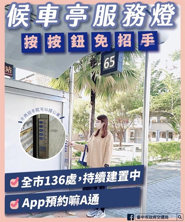 搭車民眾針對台中市府交通局的設計,按下要搭乘的公車號次,不用站到候車亭外招手攔車,直呼「好聰明,有愛心又智慧的候車亭」;交通局表示,候車亭廣設服務燈啟用後每月使用逾7萬使用次數,以文心路廊使用最為頻繁,今年再追加預算,建置100座無障礙候車服務燈系統,現正進行設置地點勘查,以大型醫院優先考量,方便長者就醫搭公車。