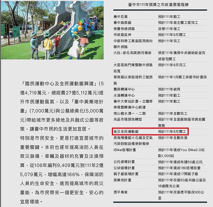 依據市長臺中市議會第三屆第六次定期會施政報告(2021年10月)第21頁,位於特區高鐵路一段西側國中預定地(文中2用地)的「烏日全民運動館」目前設計作業中(教育部體育署補助興建經費1億元),建物規模為地上3層,將兒童運動規劃於全民運動館主體工程,初步規劃兒童運動空間、韻律教室、瑜珈教室、全齡體能訓練場、新型態健身房及綜合多功能球場等設施。預計明年6月開工,但以政府採購法須跑招標等流程及建造成本增加等因素,恐難如願希望最晚至少能明年底開工了…