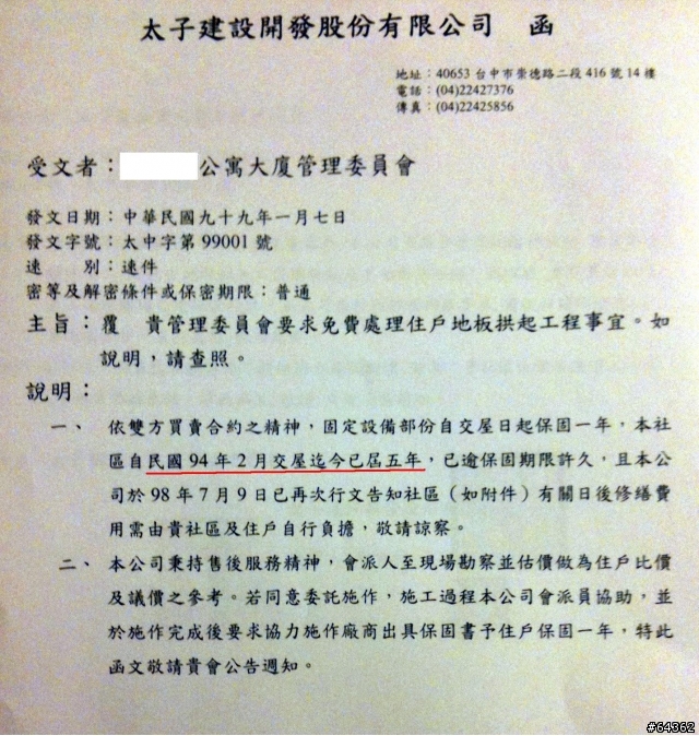 後來終於等到080客服人員回電,還是說明已過保固,須自費維修!!...我不同意建設公司的回應!!還是要求建設公司應負起責任.之後,客服人員請他主管回電給我,說明這是普遍的現象很多建設公司也有這情形,且已過了一年保固期!聽了更氣人!!難到普遍的錯誤,就是應該的嗎??...地磚普遍爆裂卻成為理所當然!!,,要我們去接受非瑕疵品,哇!!!...本社區4年來已有近一半戶數錄續爆裂(全社區2百多戶)..目前機率已逹1/2了...這樣還不是瑕疵嗎??(我這樣反應給那位主管)那位主管,還是堅持,已過一年保固,非瑕疵品不能用五年求償的法條來要求!!我還是希望那位主管能反應我的不滿,後來請那位主管告訴他們的老闆,希望建設公司能負起責任!!過了大約兩週後!!建設公司來了這樣的文!!紅色字...94年2月....到現在已五年了....(太誇張了...是為了躲避民法條文的5年寫的嗎??且發生的時間是98年12月)已跟建設公司明白說明,提出應負的責任問題,目前回應還是堅絶不做保固!!這樣子請教各位大大該如何呢??希望建設公司能為當初支持他們的客戶想想!!,朋友若問我太子建設的房子如何!!我又該如何回答呢??