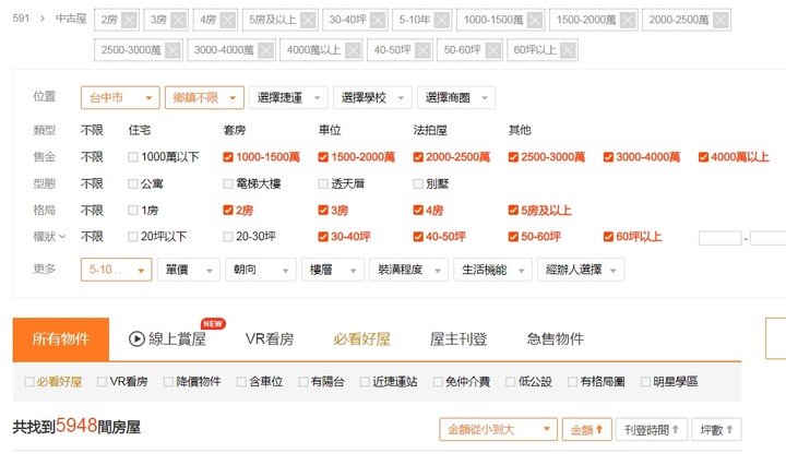 設定條件 , 5~10年的房 , 30坪 2房 以上 , 1000萬以下 , 範圍台中市 .