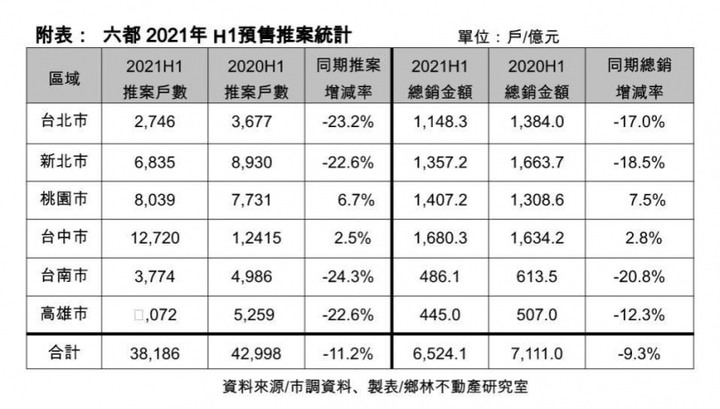 鄉林不動產研究室根據建商開工及建照申請資料統計,今年上半年六都預售推案戶數約3.8萬戶、總銷規模6,500億元,與去年同期比較年增率分別是-11.2%與-9.3%,除了桃園和台中市有小幅成長之外,受到政府打房的風向影響,加上疫情加劇、無薪假人數持續增多,連帶也造成購屋人心理恐慌,多數都會區推案量衰退逾二成,連帶使總銷金額也下滑。