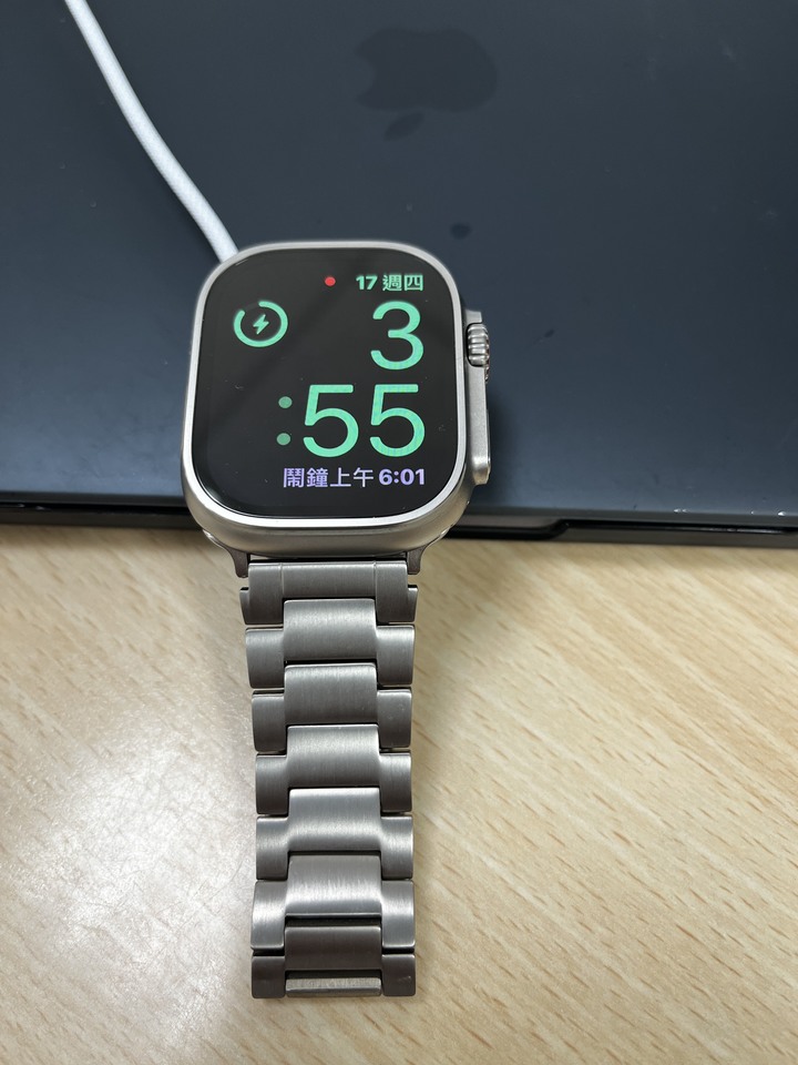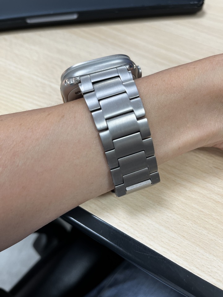 淘寶買的鈦錶帶,質感跟U的材質不會差太多,拆裝錶帶很順,調長度也不會太難,拿掉了四節才調成適合的長度, 只是常接觸辦公桌的那一面 ,用一個禮拜就磨成這樣。