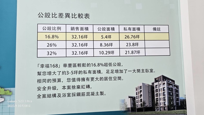 新年期間去了一趟潮州感受過年氣氛.在很多的路口發現一塊很醒目的售屋廣告.(幸福168)強調只有16.8%的公設比.在好奇心的驅使便繞過去看看.碰巧遇到泰武建設的蔡董帶客戶賞屋.這棟華廈蓋得很用心.連浴室都是鋼筋混凝土結構.輕隔間牆加上無紅磚牆施工.讓最近地震不斷的南台灣.增加很多的安全感.低公設讓房子內部看起來空間很大.格局配置得很好.戶戶2~3面採光.推薦各位前來參觀.
