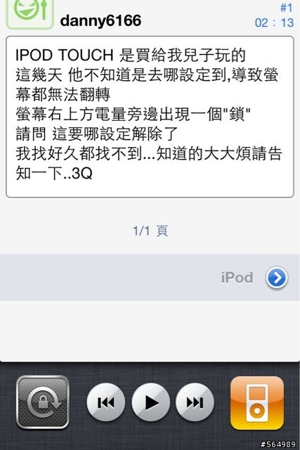 danny6166 wrote:IPOD TOUCH 是買給我兒子玩的這幾天 他不知道是去哪設定到,導致螢幕都無法翻轉螢幕右上方電量旁邊出現一個"鎖" 請問 這要哪設定解除了我找好久都找不到...知道的大大煩請告知一下..3Q...(恕刪) 左邊第一個按一下就可解除