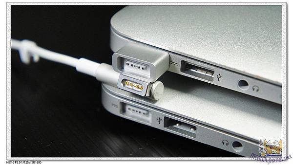 下圖是兩台AIR,上面那台是新款的,下面那台是舊款,不難發現他新款的充電頭已經變得比較長比較薄,充電頭的部分也從L型又變為T型的。