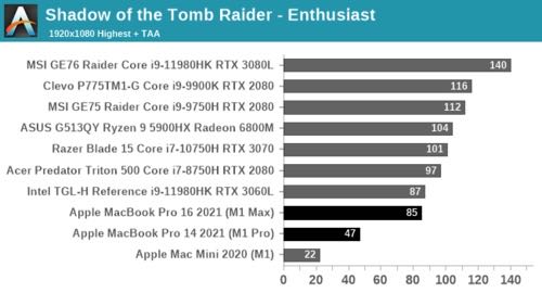 桌上型3090*0.67倍 = M1 MAX = 筆電型3080(應該是非滿血版) = M1*2.7倍