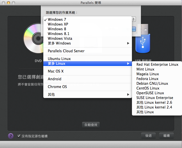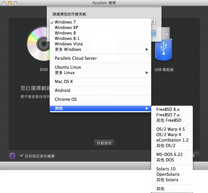 需要在同一台機器上安裝不同系統的開發者,或者想玩玩不同系統的一般使用者,利用Parallels的虛擬機可以輕鬆安裝不同的系統,而且步驟相當簡單,你想得到想不到的系統幾乎都可以裝,但你必須要備有原本安裝的光碟、映像檔、隨身碟等才能夠安裝喔