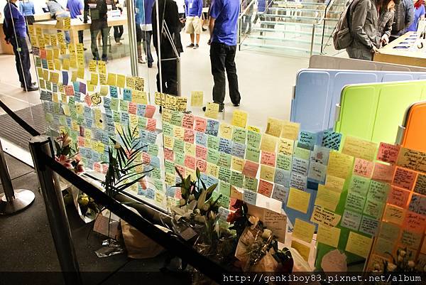 老賈剛上雲端的那幾天,很多人來到旗艦店前面貼上祝福的小紙條,這是美國人致敬一個人的方法。(詳參:2011.10.06 Steve Jobs上雲端後的Apple Store)