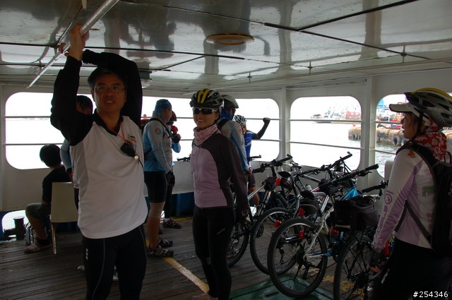 單車依序排好,船長稱讚來自屏東的肉腳團,直說從沒看過這麼有紀律的單車隊。