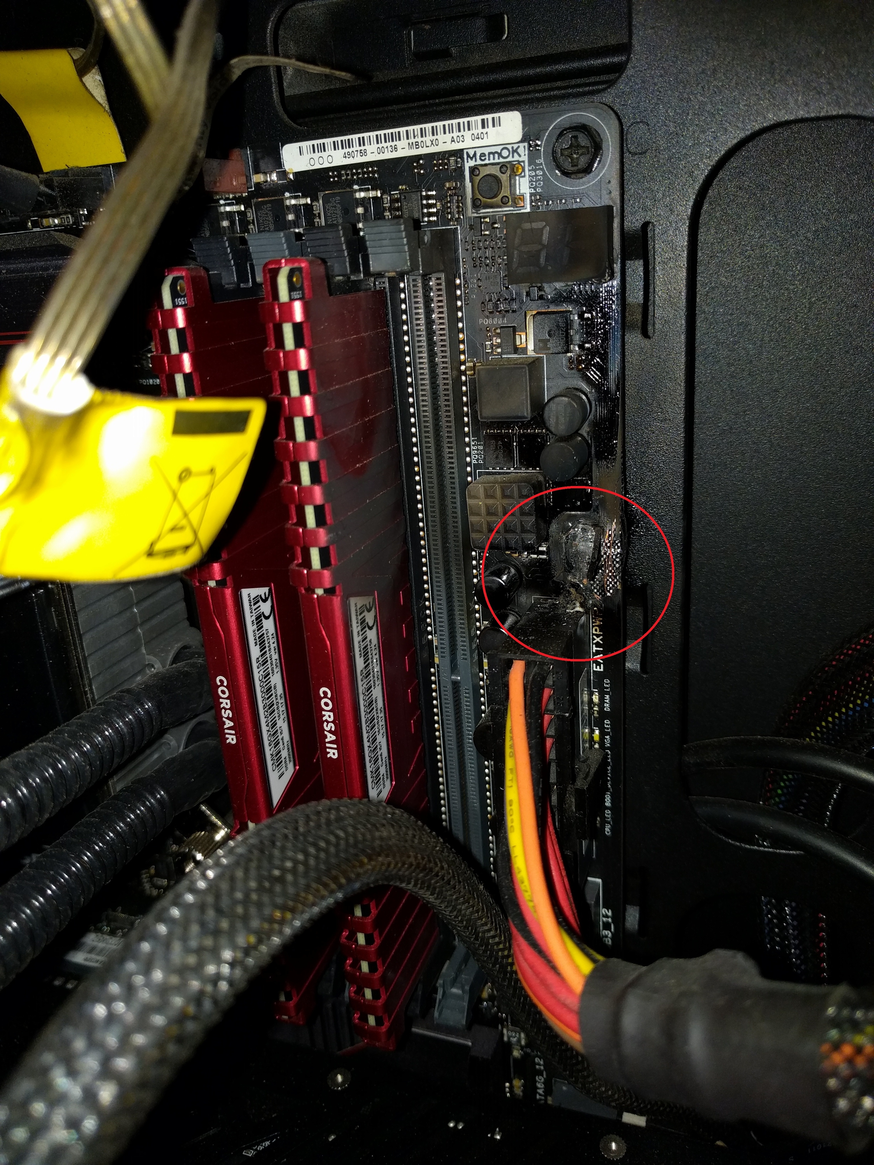 Probe00 wrote:EATX電源上面是...(恕刪) 從照片的起火點看起來是這個位置主機板是是ROG M8R那位置的確是風扇pin腳起火點旁邊沒有任何晶片組 或者是供電模組這不算是主機板的問題如果是風扇等其他問題 造成起火原因這屬於人為因素