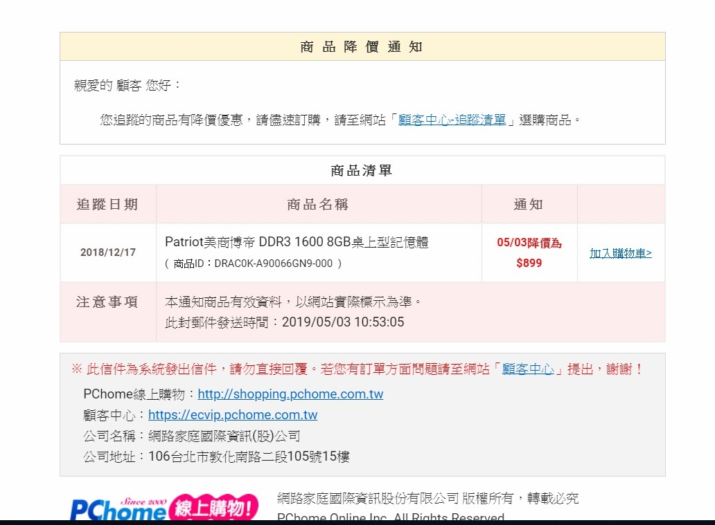 純粹只是路過而已 wrote:好特別 bighan...(恕刪) 現在跟金士頓8GX2混插使用至今沒有問題。今天PCHOME E-MAIL通知又調降特價 $899 ,可是點進去看還是$1199又寄來一封 此封郵件發送時間:2019/05/03 11:35:32 改成$859 更便宜了。。。。。。。