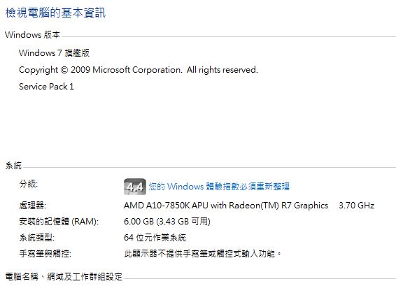 uuhp222 wrote:我也有一樣的問題。請問我電腦裝了6g記憶體,可是為什麼只顯示3.43g可用?我是win 7。https://upload.cc/i/BkmY58.jpg以上是我的圖檔。 應該是一樣的問題有一條2G記憶體有讀到但是無法正常運作這時候建議就是拔起來重插或是單條插測試