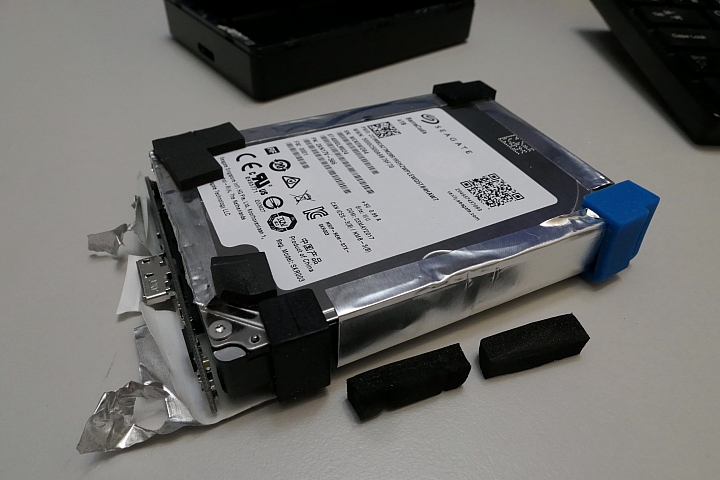 因為是補拍的,所以沒有「硬碟躺在盒子裡」的畫面。取出的硬碟是這樣,硬碟由一張鍚箔紙完全包覆,四個角有橡膠防震墊,當它還躺在硬碟盒内時,四周也有好幾塊防震橡膠墊墊著,如圖中下方的2個黑色墊子