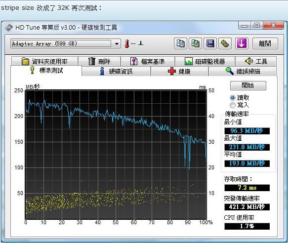 你這個真的夠猛,比某牌的RAID卡 組出來的,效能還要好,真是跌破眼鏡。RAID卡組出來平均傳輸量是差了一點,搜尋時間也慢了一點,當然跟CPU還有RAM還是有相關性的,這樣說也不準,不過證明ICH9R也是有不錯的性能,大家就不用執著一定要用RAID卡。其他網站搜尋到的Adaptec RAID 5405 上 迅猛龍x2 RAID0