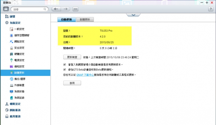 >> 有人有出現BUG的嗎,更新下去後出現MAC位址異常。mac位址異常的訊息是出現在那裡?>> 有人知道QNAP每次重開機都會掃描媒體櫃是甚麼原因嗎? 能使用之前掃描好的索引就可以了嗎?它會引用之前 scan 好的 index, 它應該不會每次都要從頭來過.>> 1. 外接硬碟接到453PRO上面任何提示都沒有就格式化你的硬碟,滿滿2T的照片,打電話他們也攤手沒辦法處理。不曉得你用的是那個型號的外接硬碟? 如果這款外接硬碟每次接上 NAS 都會被 format, 那可能真的是軟體上的問題, 必須解決, 你可以重覆再做幾次實驗看看. 這確實是蠻怪的問題, 客服應該希望能夠重建此問題.>> 2. 一般的存取資料,但是一段時間效能都會降低須重開機,無下載BT。效能降低是由何處得知?建議你可以貼上參考的擷圖或是數據, 在當下就連絡客服連線 check.