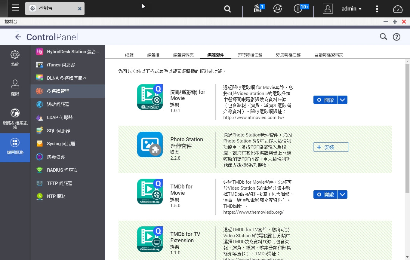 提到 Video Station, 它能根據影片的檔名幫你至 Internet movie DB 取得海報及電影資料, 但這必須安裝額外的 movie/tv database plug-in, 不過自己是不太習慣 QTS 將這類的功能另外做成 plug-in 方式發行, 好處透過 plug-in 可以方便安裝更多的功值套件進來, 用不到的套件就不用安裝省空間, 但不方便的地方是 user 會覺得系統很複雜, 尤其是像下面這 plug-in 安裝是另外做在 QTS 控制台, 而不是在 Video Station 程式設定內. User 怎麼會曉得要到這裡設定?