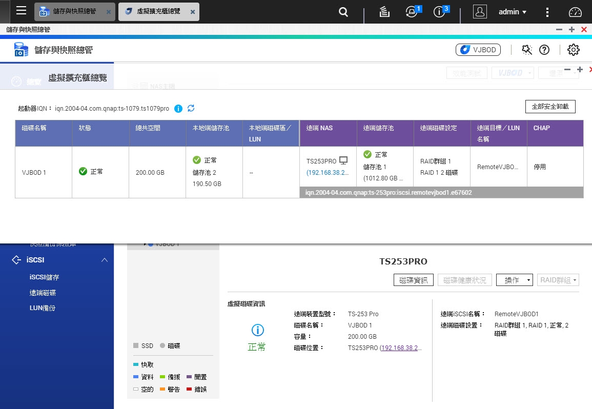 Virtual JBOD(VJBOD) 簡單說就是把網路上另一台 QTS NAS 來當做為擴充櫃.
