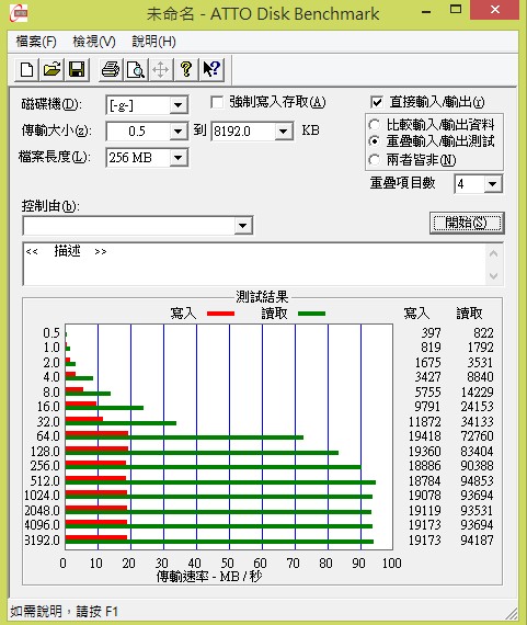 今天網購一張 金士頓 MICRO SDHC 32GB C10,包裝標示:讀取90MB / 寫入45MB。手邊沒有USB3.0 的讀取設備,所以底下數據為USB2.0 得到的結果。-----------------------------------------------------------------------CrystalDiskMark 3.0.3 x64 (C) 2007-2013 hiyohiyoCrystal Dew World : http://crystalmark.info/-----------------------------------------------------------------------* MB/s = 1,000,000 byte/s [SATA/300 = 300,000,000 byte/s]Sequential Read : 20.030 MB/sSequential Write : 19.758 MB/sRandom Read 512KB : 19.624 MB/sRandom Write 512KB : 0.825 MB/sRandom Read 4KB (QD=1) : 5.056 MB/s [ 1234.4 IOPS]Random Write 4KB (QD=1) : 0.375 MB/s [ 91.6 IOPS]Random Read 4KB (QD=32) : 5.184 MB/s [ 1265.6 IOPS]Random Write 4KB (QD=32) : 0.395 MB/s [ 96.4 IOPS]Test : 1000 MB [J: 3.3% (1.0/29.9 GB)] (x5)Date : 2014/09/12 22:45:44OS : Windows 7 Professional SP1 [6.1 Build 7601] (x64)另外附上A1 SD bench的測試結果:手機:LG G3讀取:53.33MB寫入:36.92MB提供各位參考